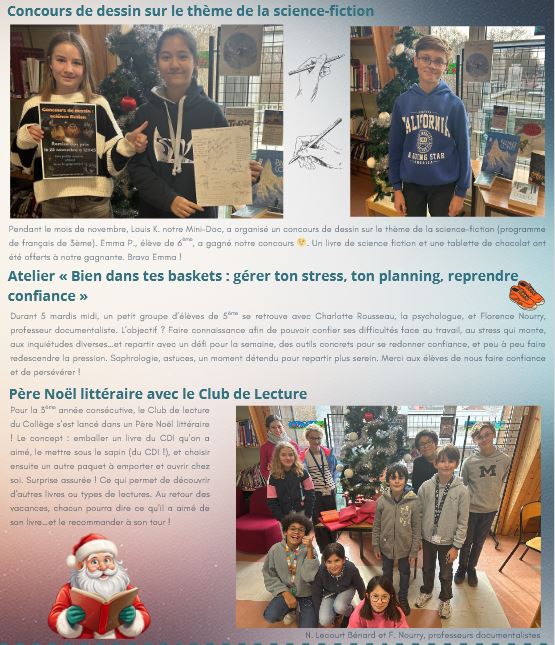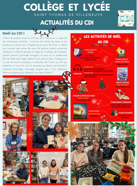 L’Avent se prépare aussi au CDI qui, pour l’occasion, a organisé de nombreuses activités : concours de cartes de vœux et de poésie sur le thème de « L’Espérance au cœur de l’hiver », atelier