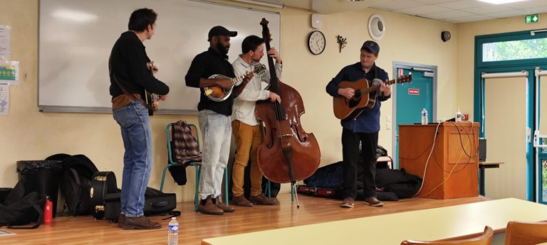 Munis d’une guitare, d’une contrebasse, d’un banjo et d’une mandoline, les quatre musiciens ont chanté des ballades de Bluegrass puisées dans le folklore du Kentucky, traitant de sujets variés tels que la pluie sur les carreaux, le mal du pays, ou encore l’amour. Leurs airs enlevés, leur énergie, leur style décontracté et l’humour de leurs échanges en anglais nous ont transportés au-delà de l’Atlantique.