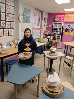Guidés par un plan de construction proposé par notre maîtresse, nous avons utilisé à la fois les arts plastiques et la géométrie pour réussir. Entre tracés précis, assemblages minutieux et quelques interprétations… créatives du plan, chacun a donné vie à sa machine. Si certaines réalisations pourraient presque rivaliser avec les inventions du maître, d’autres témoignent surtout d’une grande imagination… et d’un léger goût pour l’improvisation !