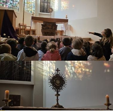 Prendre du temps pour l’adoration : chaque classe s’y allé à la Chapelle découvrir la beauté de l’adoration. Quand tout concourt à ouvrir nos coeurs à la présence réelle de Jesus dans l’ostensoir. La cloche sonne tous les jeudis midis pour nous rappeler que si on veut, on peut aller quelques instants adorer à la Chapelle.